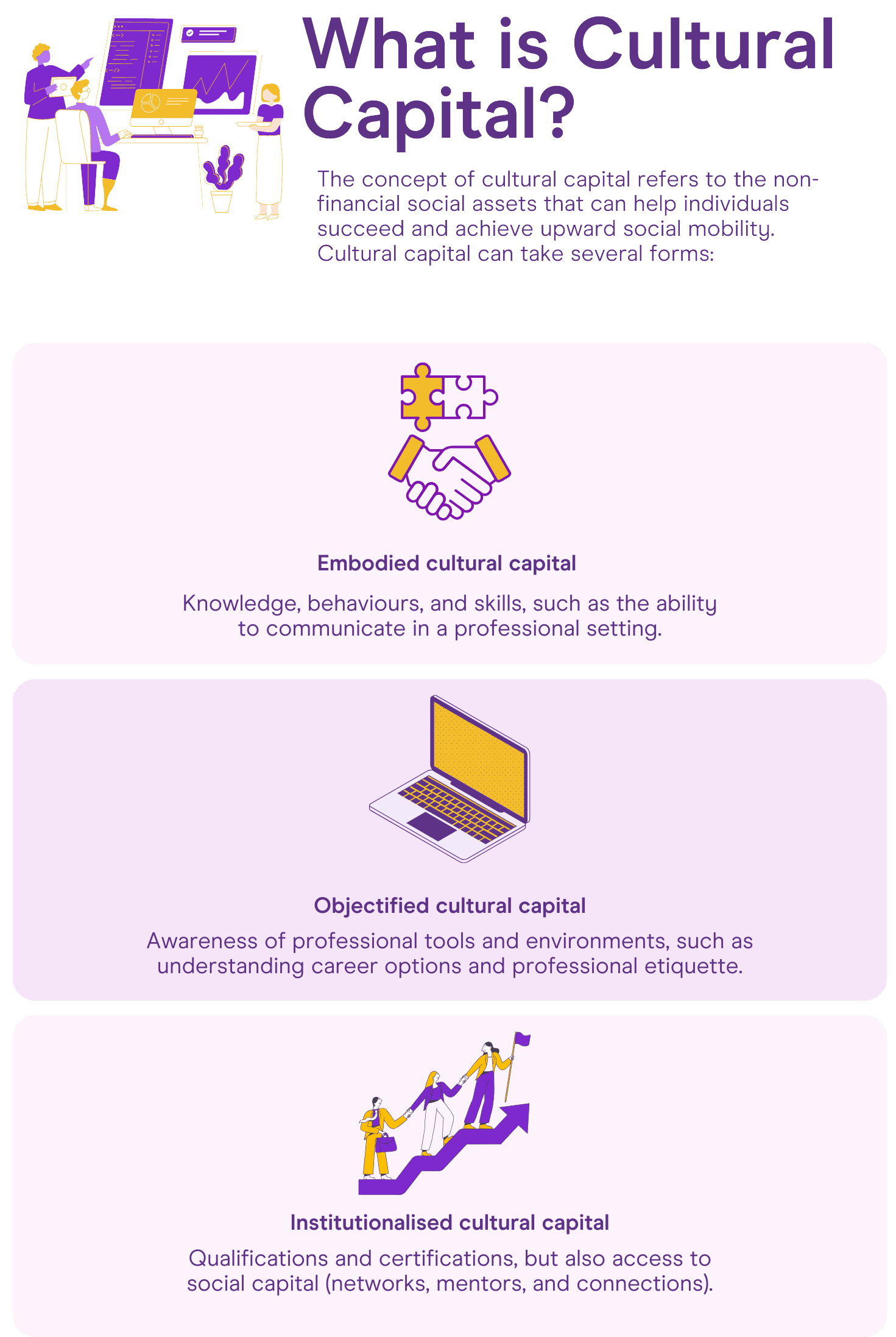 We equip students with social assets to catapult their careers forward: We believe every young person deserves equal opportunity to mentors, skills development and work experience, all of which make up a young person's cultural capital assets and promote social mobility.