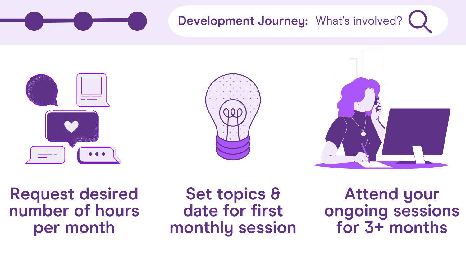 Book your Expert of choice for personal 1 to 1 sessions each month. The Development Journey is for a minimum of 3 months.